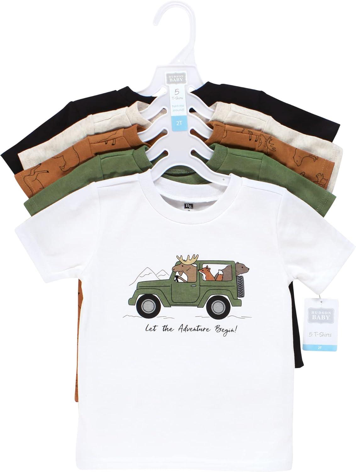 Hudson Baby t-shirts are great everyday tops for your little ones. Featuring fun prints and patterns, our t-shirts are made with comfortable, soft cotton poly fabric that feels wonderful on children's skin. Our sets include five t-shirts so you can mix and match with your child's wardrobe for fun everyday outfits.