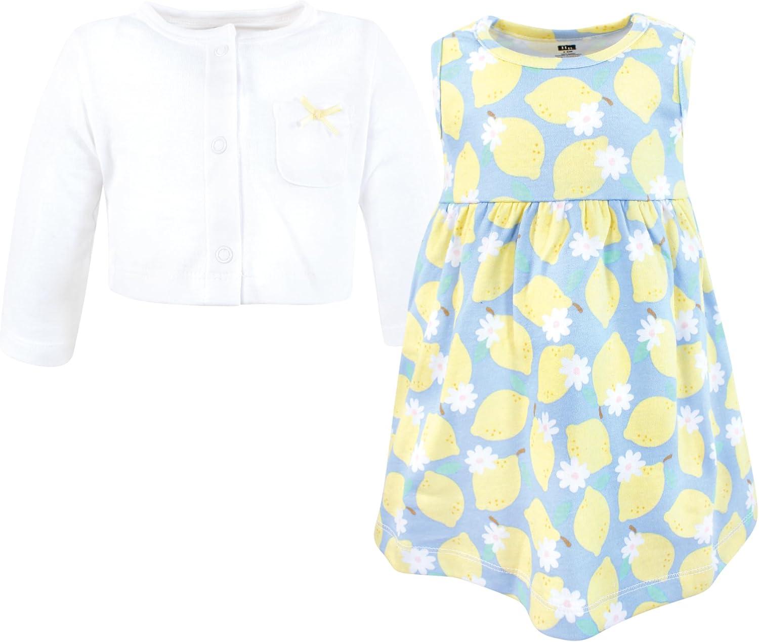 Luvable Friends Hudson Baby dress and blouse pairing creates an adorable clothing option suitable for your little girl throughout the year. Both pieces, the dress and the coordinating cardigan, are crafted from wonderfully soft 100% cotton material. The dress is designed to help stay cool, while the cardigan includes long sleeves and a convenient snap fastening for cooler temperatures. Features charming complementary colors and patterns.