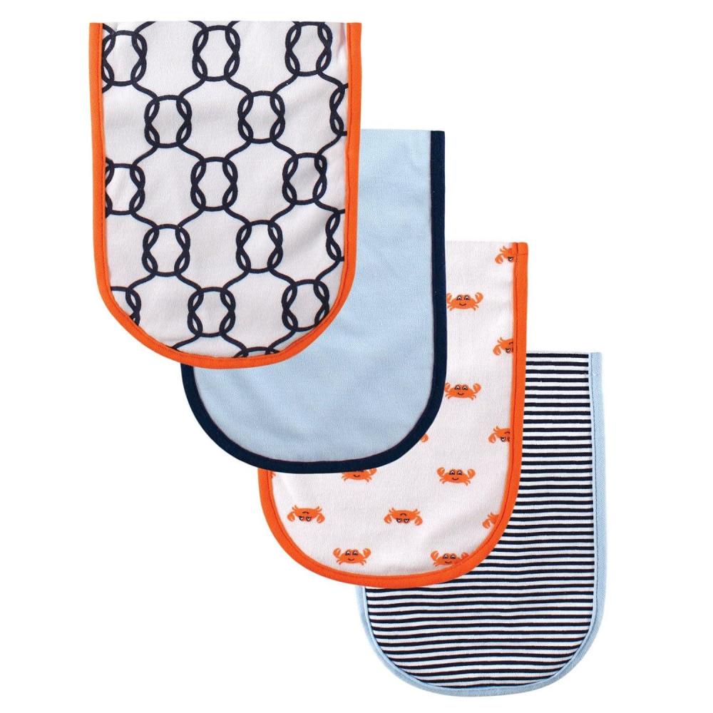 Luvable Friends 4-pack burp cloths feature super soft knit patterned fronts, an absorbent terry cloth backing, and an inner layer of PEVA to prevent spitups from leaking through, protecting clothing.